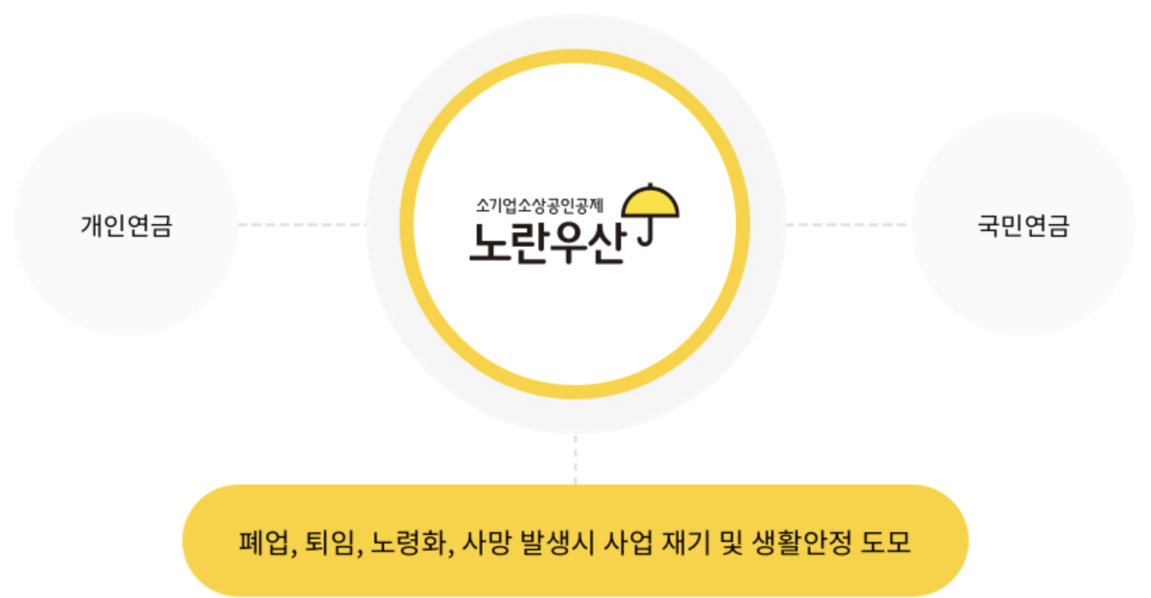 • 6월 1일부터 노란 우산공제의 지급 조건이 기존 4가지에서 8가지로 크게 확대되어 기존 폐업, 사망, 퇴임, 노령 이 4가지 경우에만 공제금을 받을 수 있었는데 이제는 추가로 4가지 조건이 더해져서 바로 자연재난, 사회재난, 질병부상, 회생파산 경우에도 지급을 받을 수 있습니다.