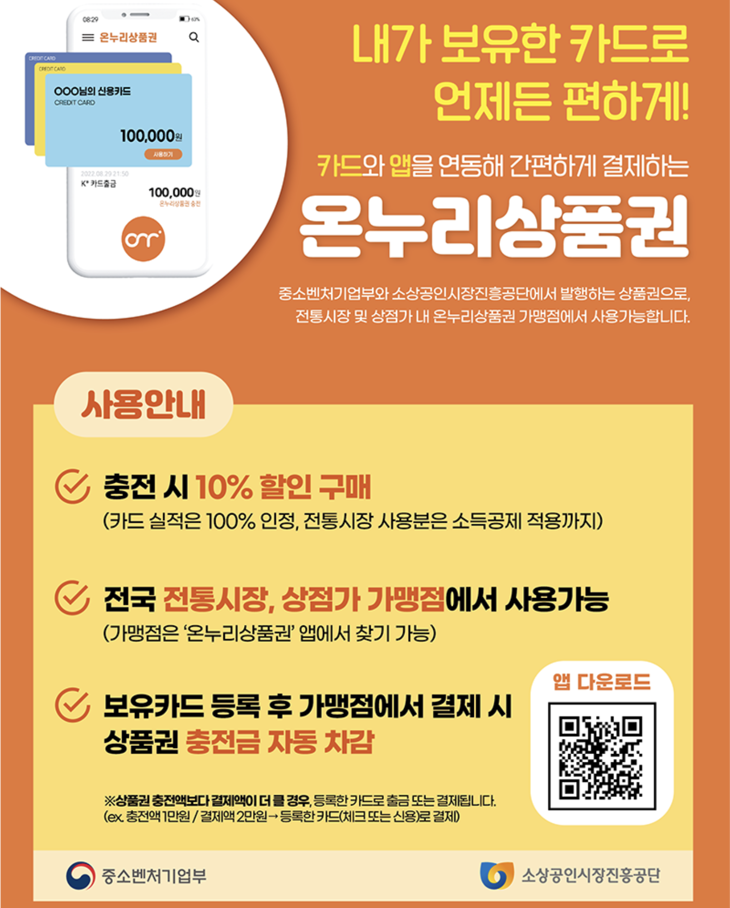 온누리 상품권은 원래는 전통시장 활성화를 목적으로 발행된 상품권으로 종이뿐 아니라 모바일 상품권도 발행되어 더욱 편리하게 사용할 수 있으며 지역 경제 활성화를 돕는 동시에 소비자에게는 다양한 할인 혜택을 제공합니다.