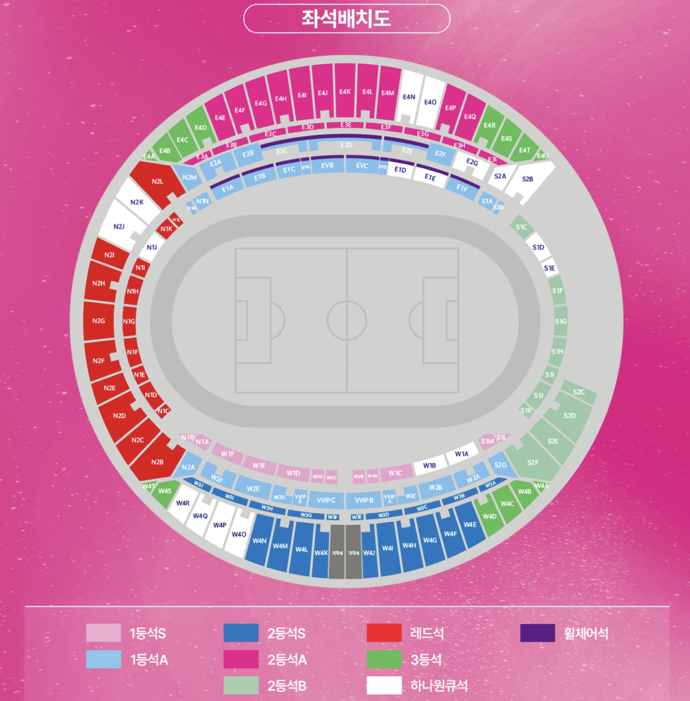 - 티켓 가격 : 좌석 위치에 따라 다르게 책정되며 가장 가까운 1등석은 12만 원 또는 9만 원이고, 2등석은 4만 원에서 6만 원 사이로 예매 가능하며 응원석인 레드석은 4만 원, 3등석은 3만 원으로 티켓 가격은 경기장의 좌석 배치도에 따라 결정되니 사전에 좌석을 잘 확인하시기 바랍니다.