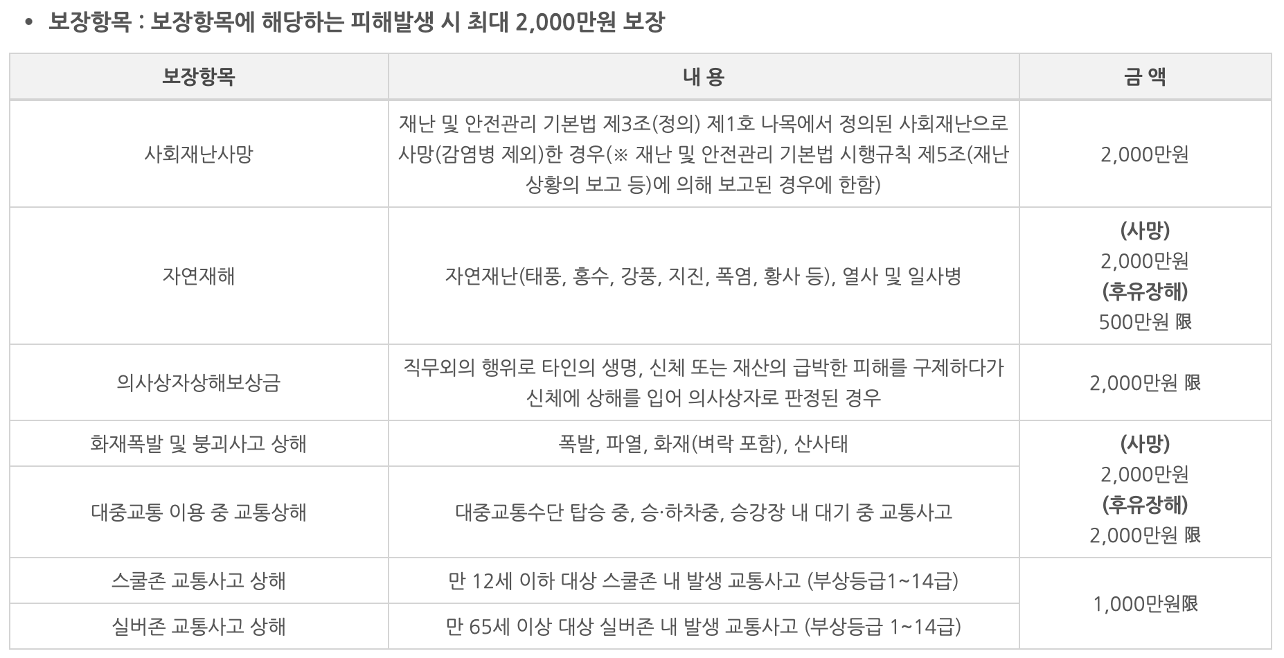 시민안전 보험은 사고 발생시 아래의 사고에 대하여 보장을 제공합니다.